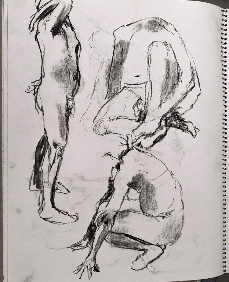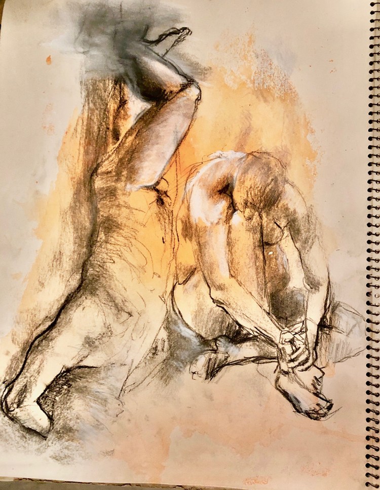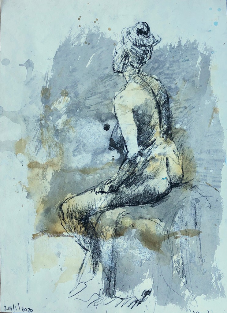 I’m fortunate to belong to a group of artists that meet each week for a life drawing session. Drawing from a model is an opportunity to hone my eye-hand coordination and really ‘look’. Beginning with quick warm up exercises of three minute sketches quickly capturing the essence of a pose, working up to longer sittings of 15 minutes and more. It’s an opportunity to play with pencils in both hands, mark making and interesting compositions. I’ve recycled some of these by collaging them into colourful small works.